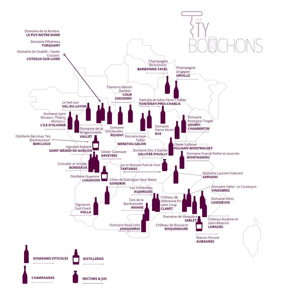 La carte des Ty Bouchons se distingue par une proposition soignée de vins de vignerons, véritable reflet de leurs terroirs, authentiques et empreints d’excellence. En portant haut les couleurs de nos vignerons partenaires, les Ty Bouchons rend accessible une sélection de vins à tous les professionnels du Grand Ouest de la France : je suis fiers de travailler à ce jour avec près de 40 domaines viticoles.